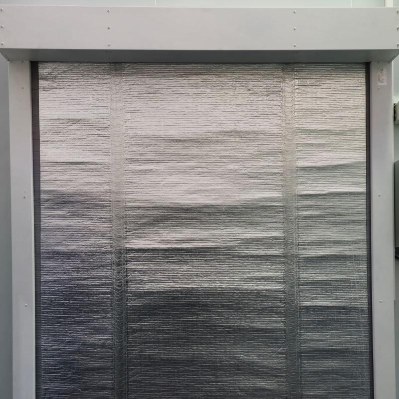 Estructura: La cortina está elaborada con tejido técnico de fibra de vidrio clase E reforzado con Inconel de acero y recubierto con Foil de aluminio por ambas caras, actuando como elemento delimitador de la radiación térmica.